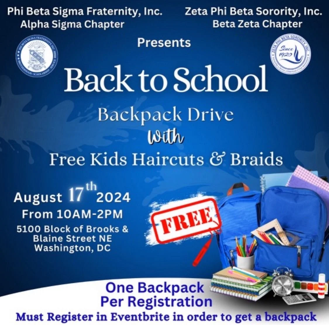Join Phi Beta Sigma for their Annual Back to School Backpack Drive & Block Party on Saturday, August 17th, from 10:00 AM to 2:00 PM at the 5100 Blocks of Brooks and Blane Street NE.